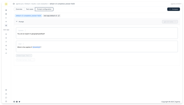 The prompt configuration tab shows the prompt configuration used for this evaluation.