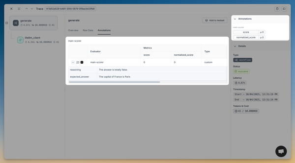 Annotations in Agenta let you enrich the traces created by your LLM applications. You can add scores, comments, expected answers and other metrics to help evaluate your application's performance.